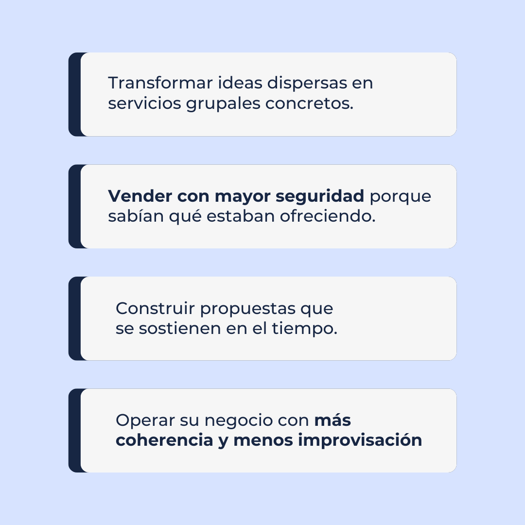 En 12 semanas vas a diseñar tu servicio grupal y aprender a tomar decisiones con criterio para sostenerlo.