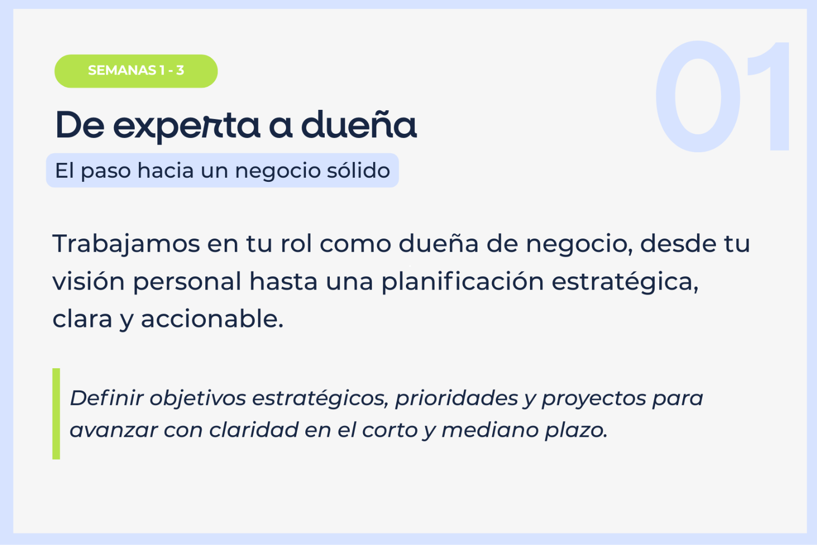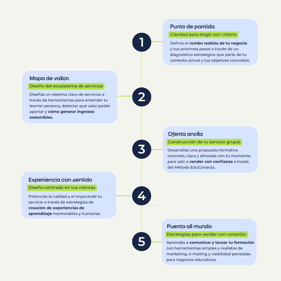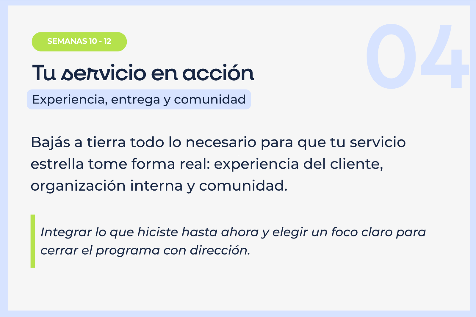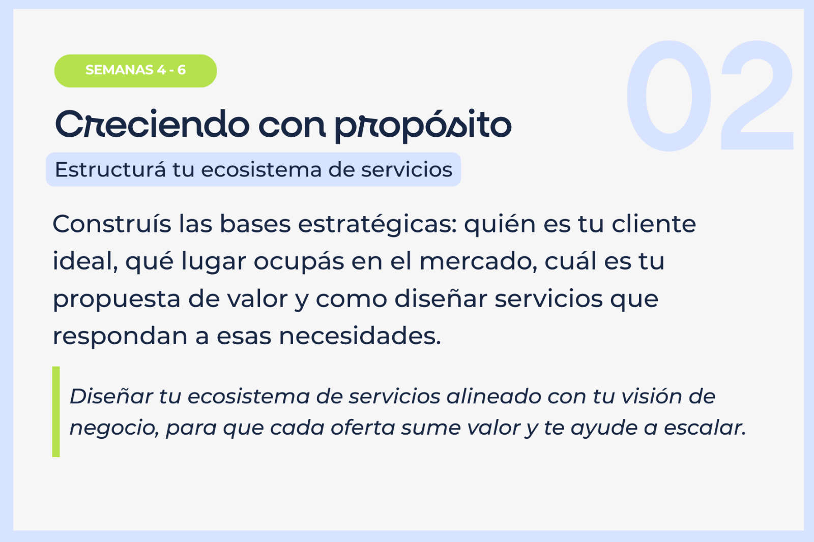 Es un proceso grupal de 12 semanas donde diseñás tu servicio formativo desde la base y trabajás sobre decisiones concretas: